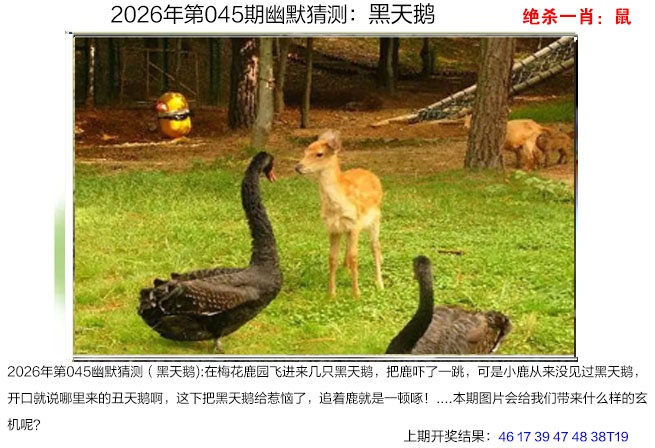 :?00】中 在梅花鹿园飞进来几只黑天鹅,把鹿吓了一跳,可是小鹿从来没见过黑天鹅,开口就说哪里来的丑天鹅啊,这下把黑天鹅给惹恼了,追着鹿就是一顿啄!..本期图片会给我们带来什么样的玄机